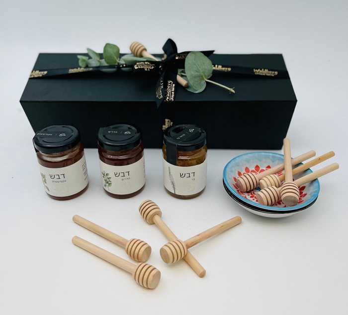 מארז בקופסת מגנט יוקרתית ובתוכו 3 סוגי דבש טהור ממכוורת פרא