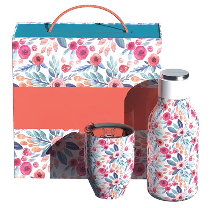 מארז מתנה פרחוני הכולל בקבוק וספל תרמי